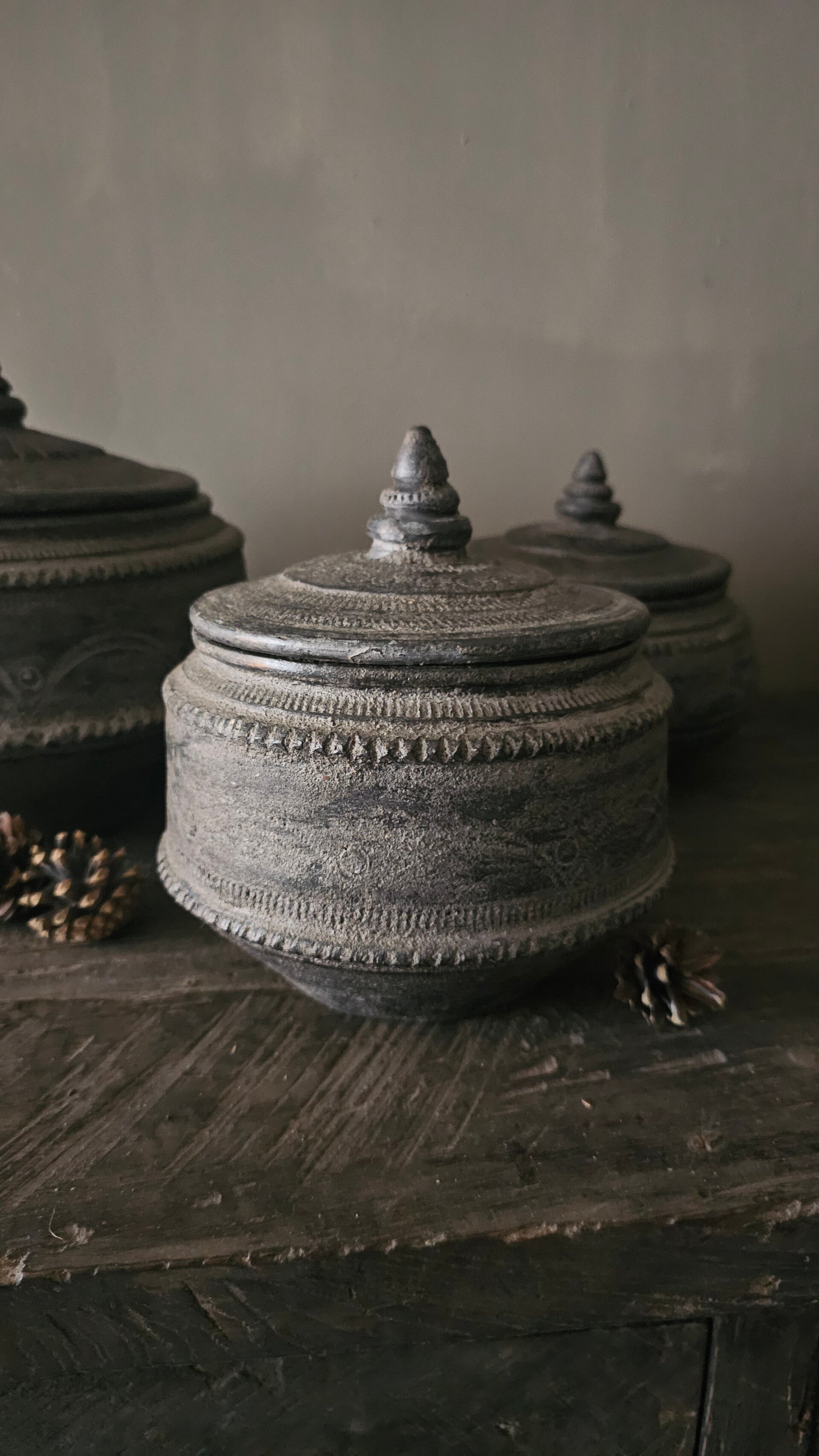 Prachtig rijk versierde pot in stenen uitvoering, op verschillende manieren te decoreren of te gebruiken.